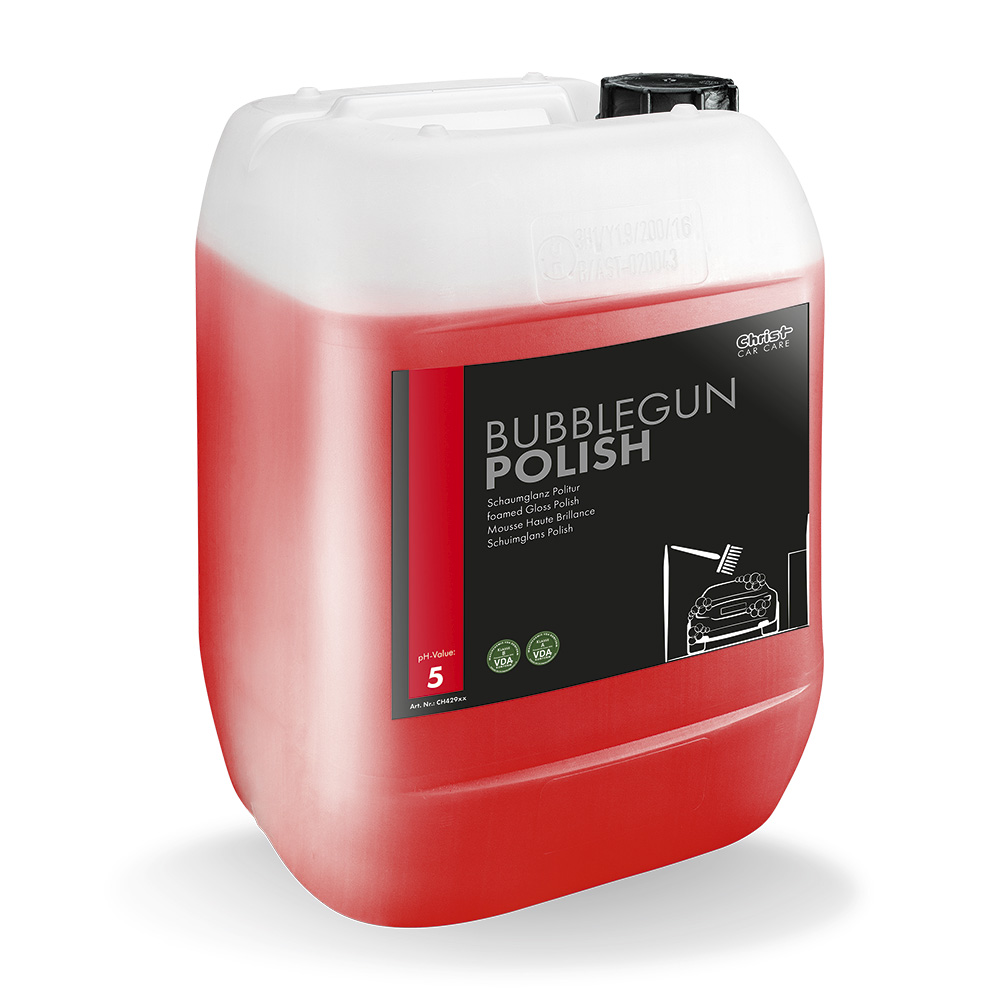 Die Schaumglanz-Politur BUBBLEGUN POLISH wird nach der Hochdruck-Wäsche mit der BUBBLEGUN Schaumpistole aufgetragen und durch die anschließende Anwendung der Softwasch-Bürste auf dem Lack einmassiert. Die innovative Formulierung lässt den Lack glänzen und wirkt wasserverdrängend (Regen-Ex-Effekt).